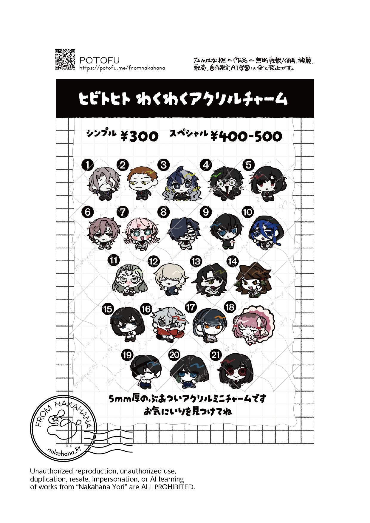 5mmの分厚いアクリルを使用した、約4cm程度のアクリルチャームです。